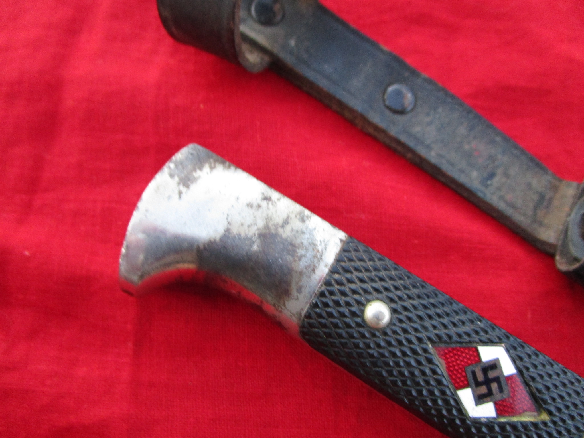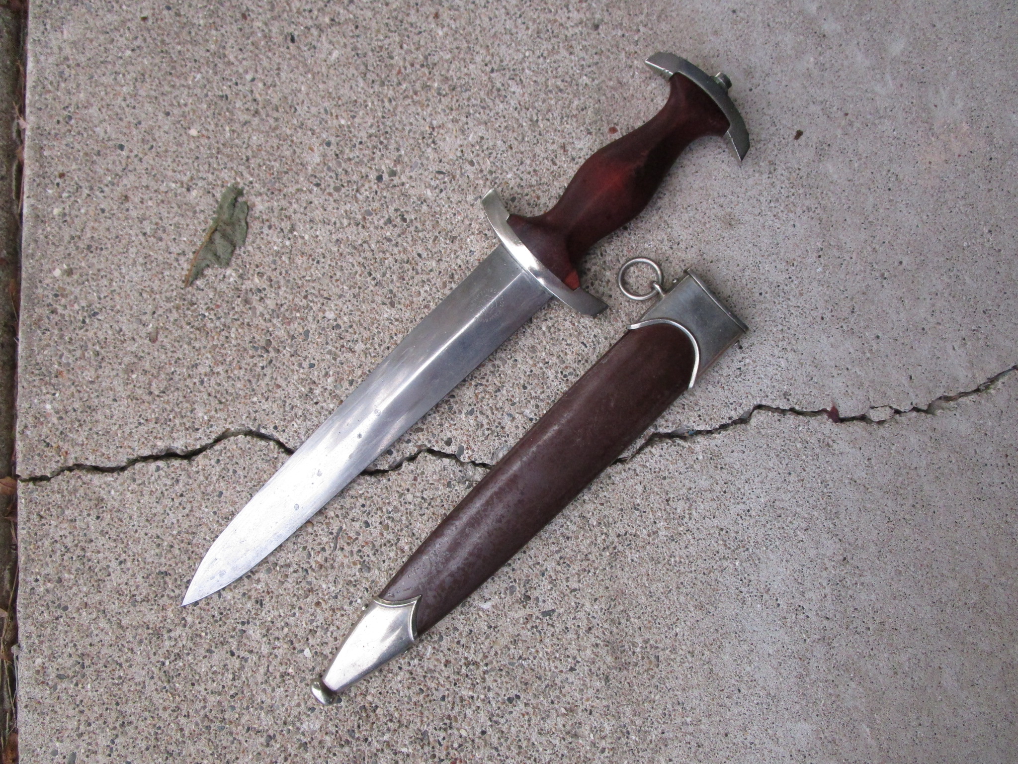 This is a very honest showing age. It has an old appearance, but no abuse or cleaning. nice honest dagger. The early fittings are all very good. The blade is good but shows old age spots. The correct scabbard is anodized and slows being 80 years old. This is just a good old honest piece, not mint but good.