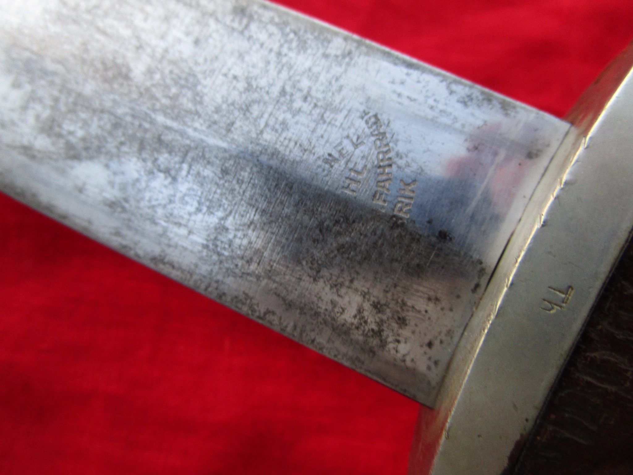 This is a good solid example showing honest age and use. The blade was stored for years with a good amount of moisture. It was subsequently cleaned leaving a good amount of pits. The reverse side has and large RZM and a maker's logo beneath it. Close inspection shows a has a letter M with oak leave below. I'm sure you dagger guys know who it is. The scabbard is good with decent but slightly dry leather. This one is a solid example priced right.