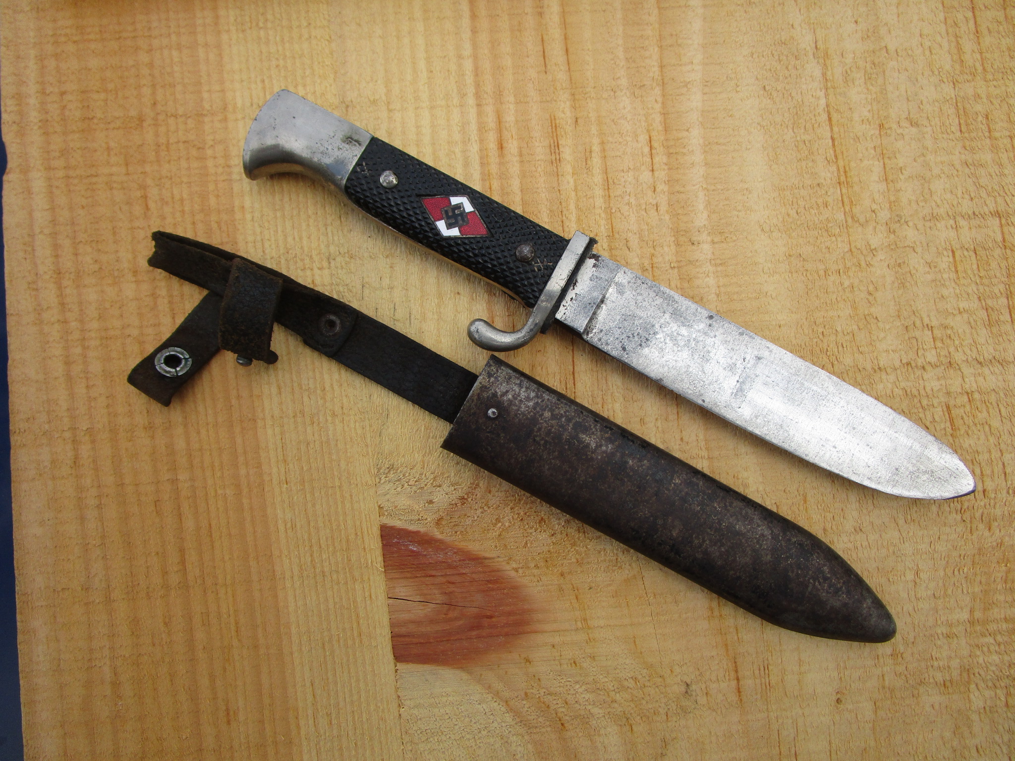 This is a nice honest dagger. The early fittings are all very good. The blade is nice showing some age spots, and very slightly tipped. The early anodized scabbard is also very good and is original to the piece, with untouched screws. The handle has a nice appearance, but missing 2 pieces on the left side (front and back). This is a harder maker to find. It's attractive, and price reasonably, to display nicely.