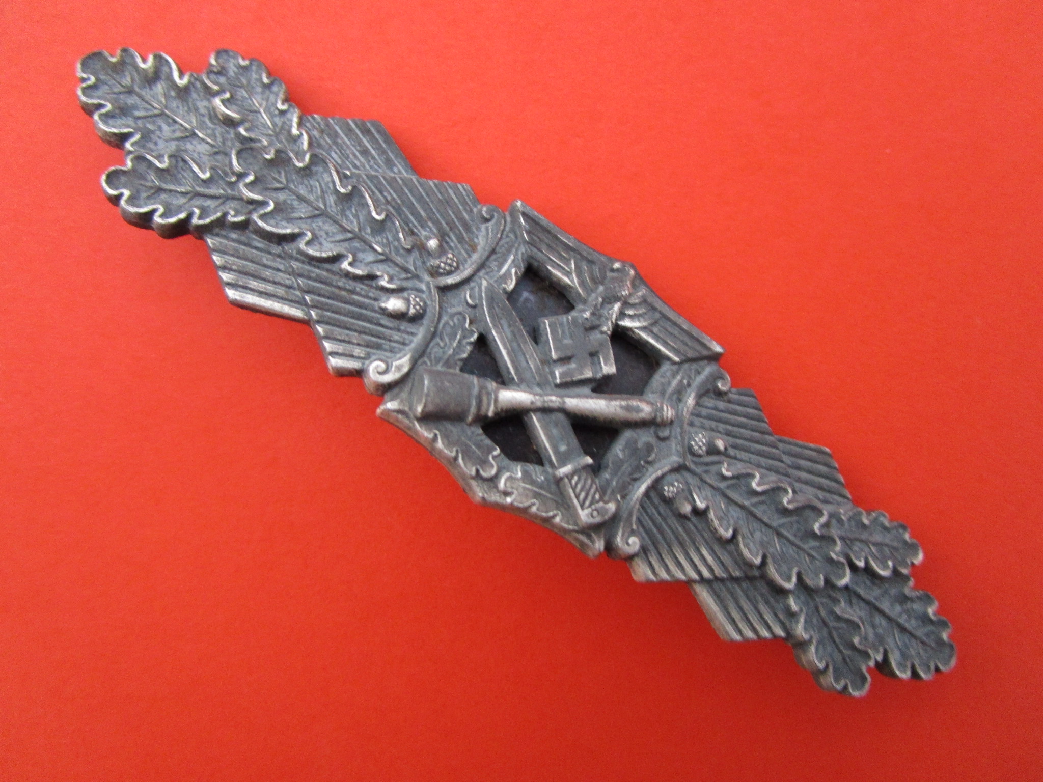 This is a nice later war showing a soft silver color typical of later war zinc badges. The eagle head plate is missing, but the one below it is nice. The back is unmarked and has a solid pin and catch set. This is a good looking example perfect for a mannequin or the budget minded collector.