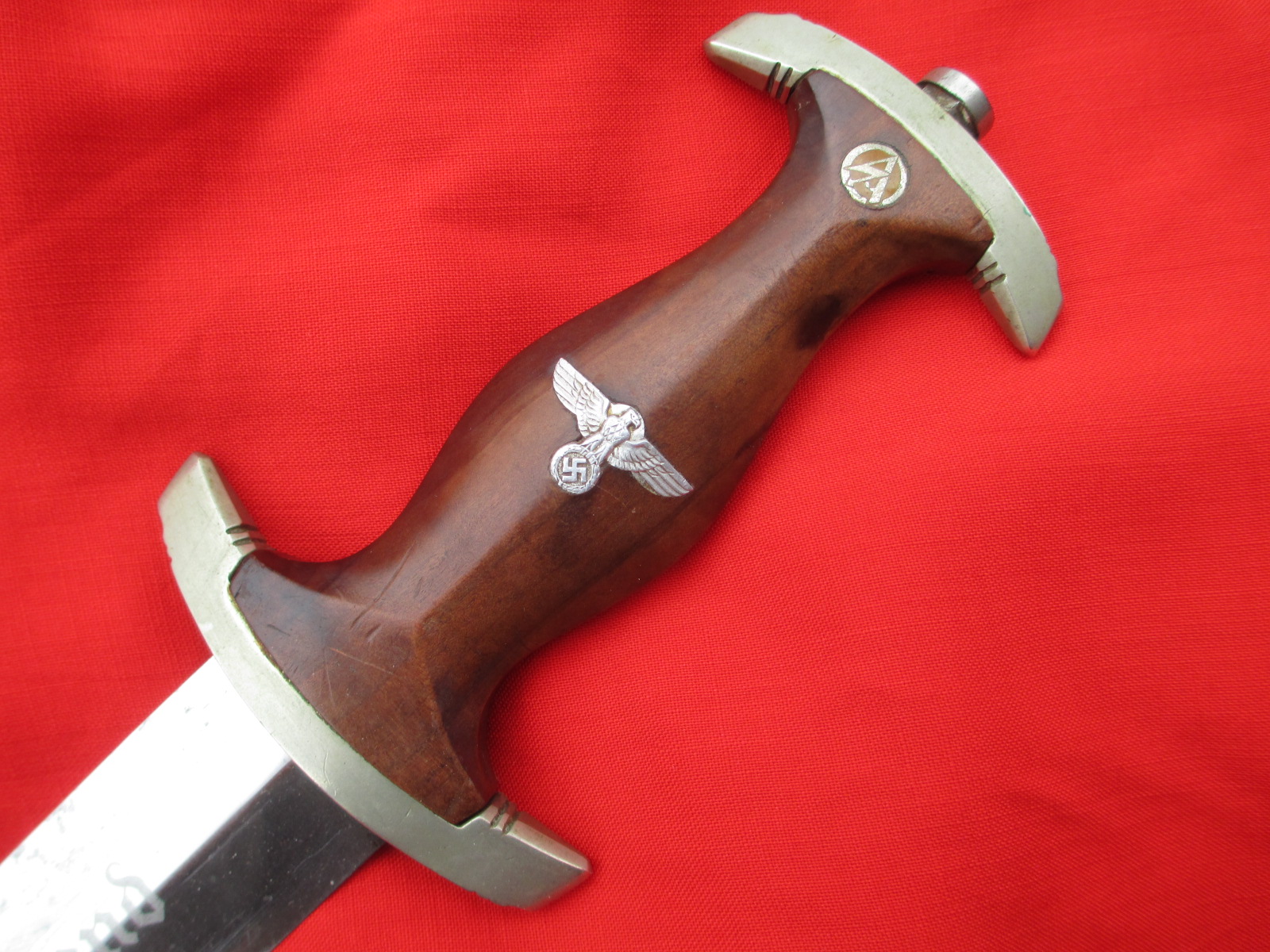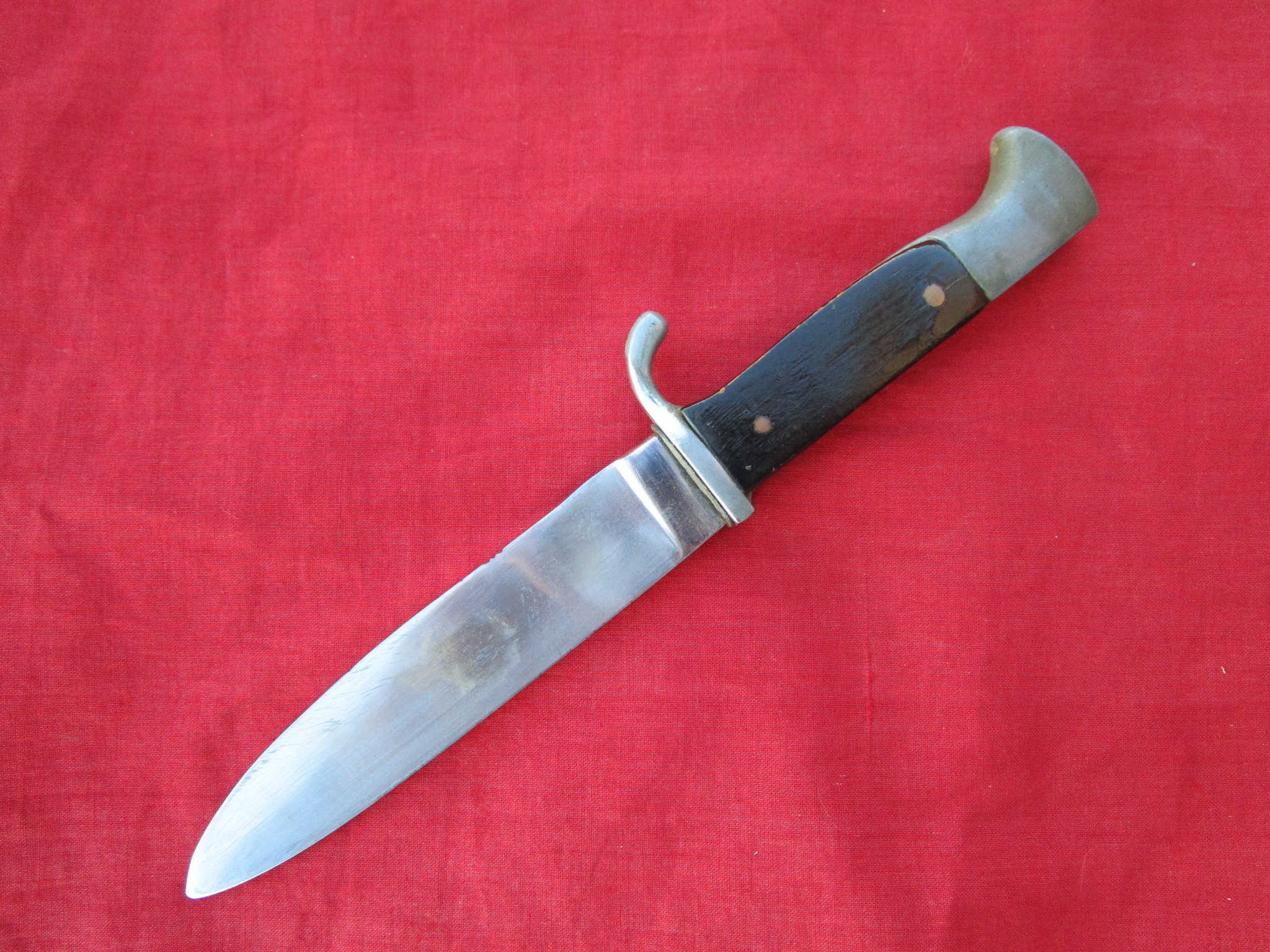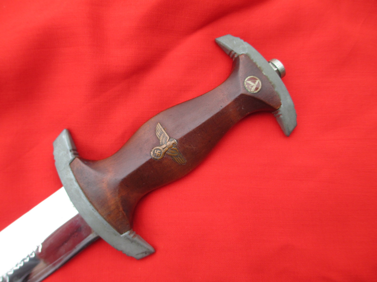 This is an honest good looking dagger. The blade is good but has been polished. The handle was replaced with wooden grips years ago. The insignia is original. The fittings are all decent. Sorry, no scabbard on this one, but it's cheap. It's the perfect economy display example. ![]()