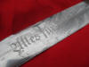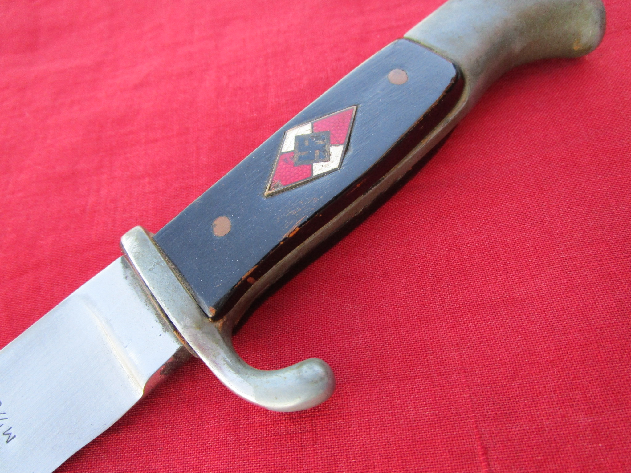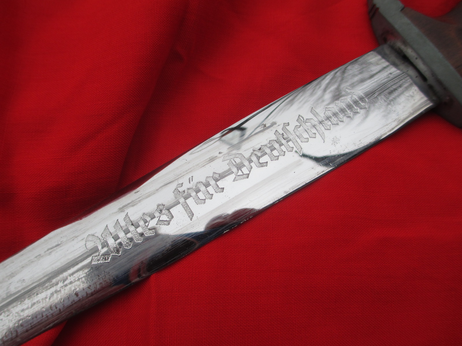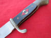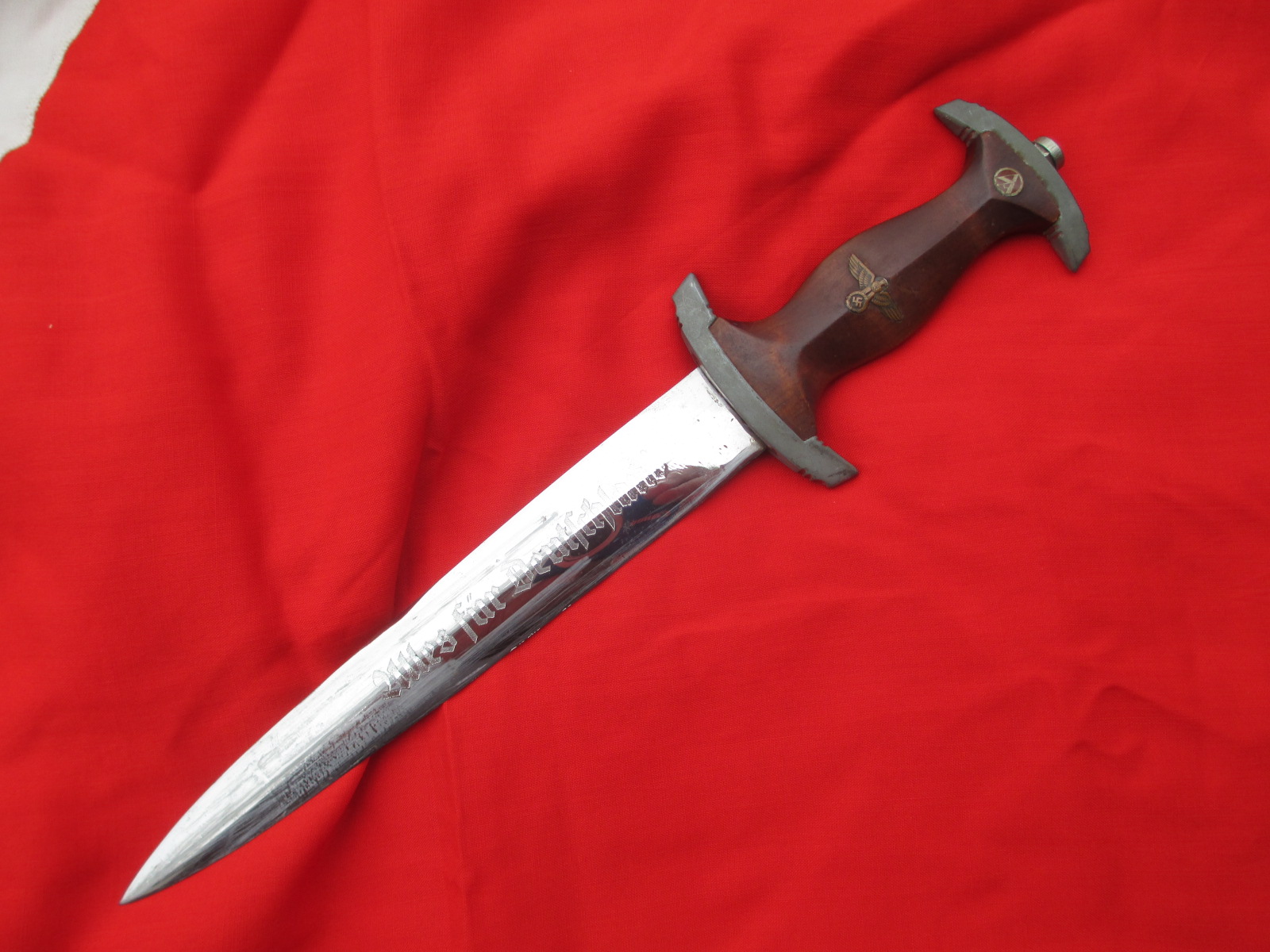 This is an honest good looking dagger. The blade is good but has been polished. The handle was replaced with wooden grips years ago. The insignia is original. The fittings are all decent. Sorry, no scabbard on this one, but it's cheap. It's the perfect economy display example. ![]()