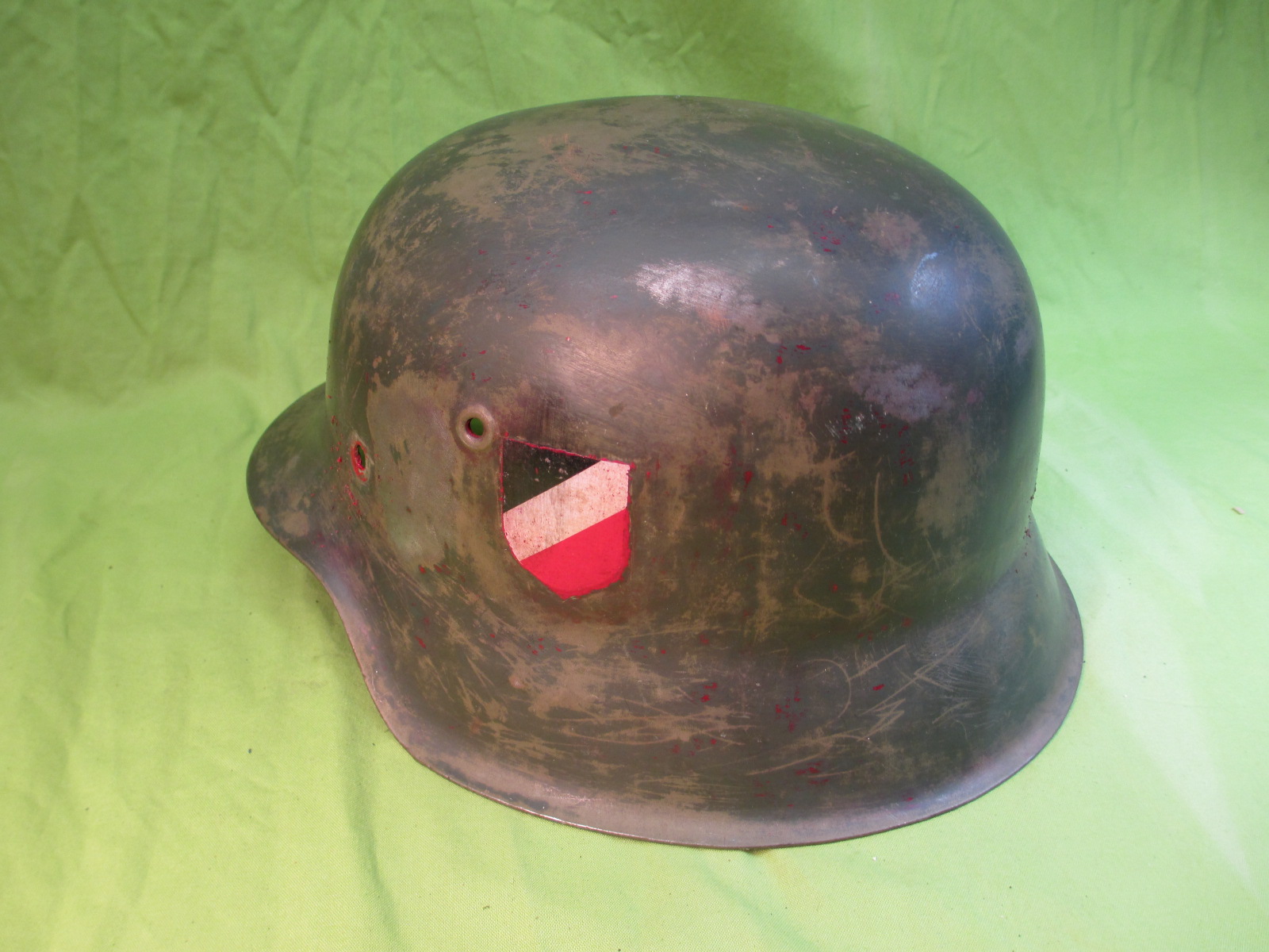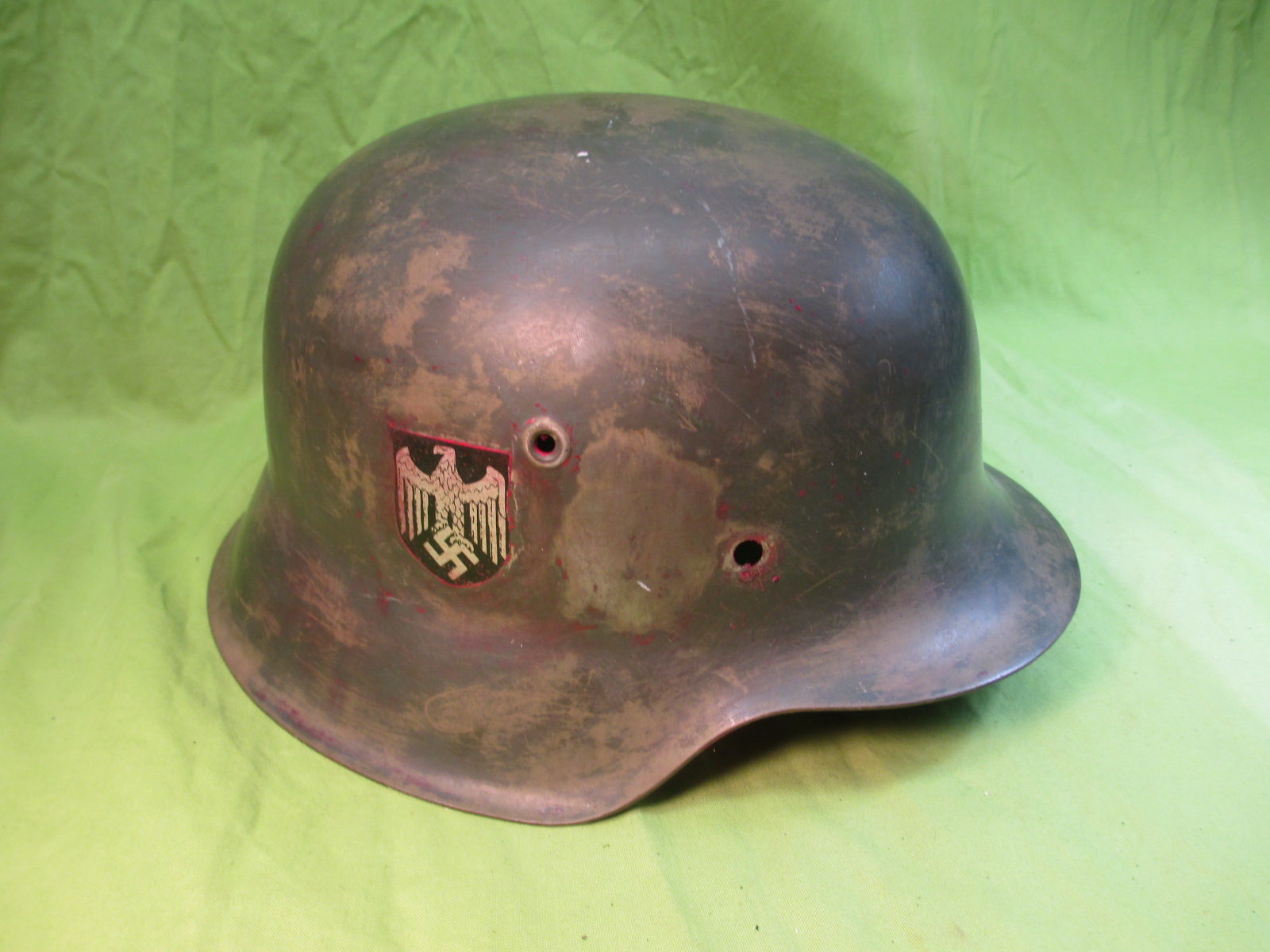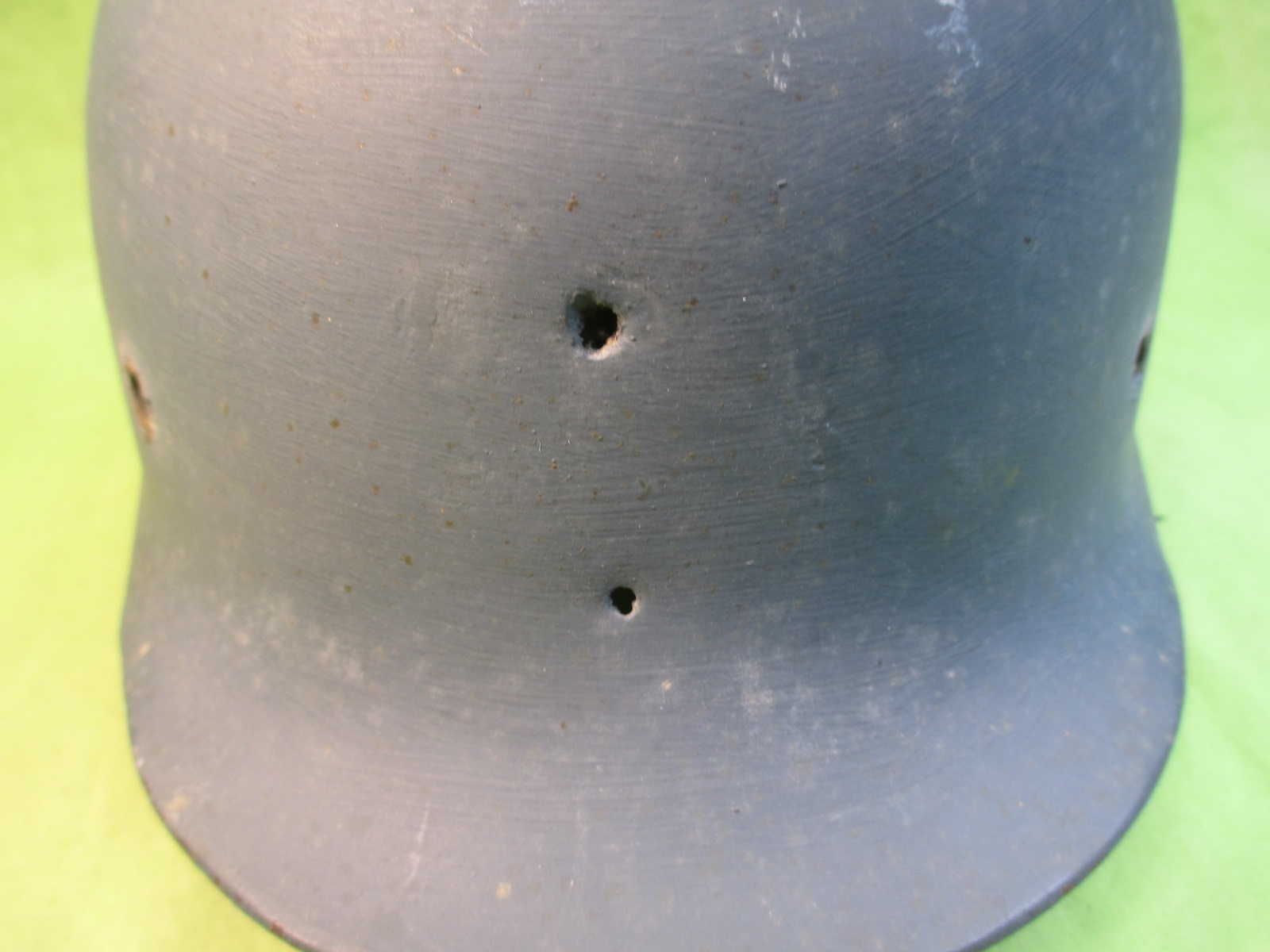 This is a good solid shell without dents or cracks, but with 2 holes punched in the front. It's ready to restore or display as is. ![]()