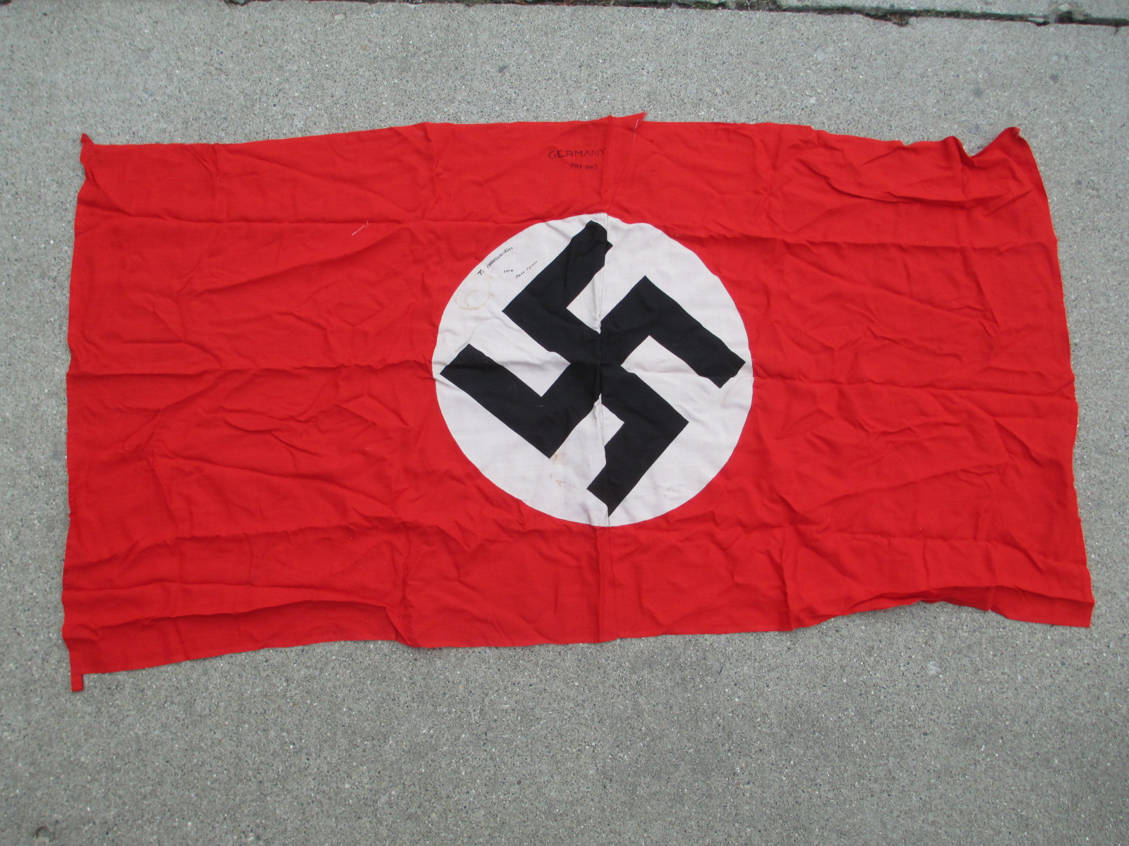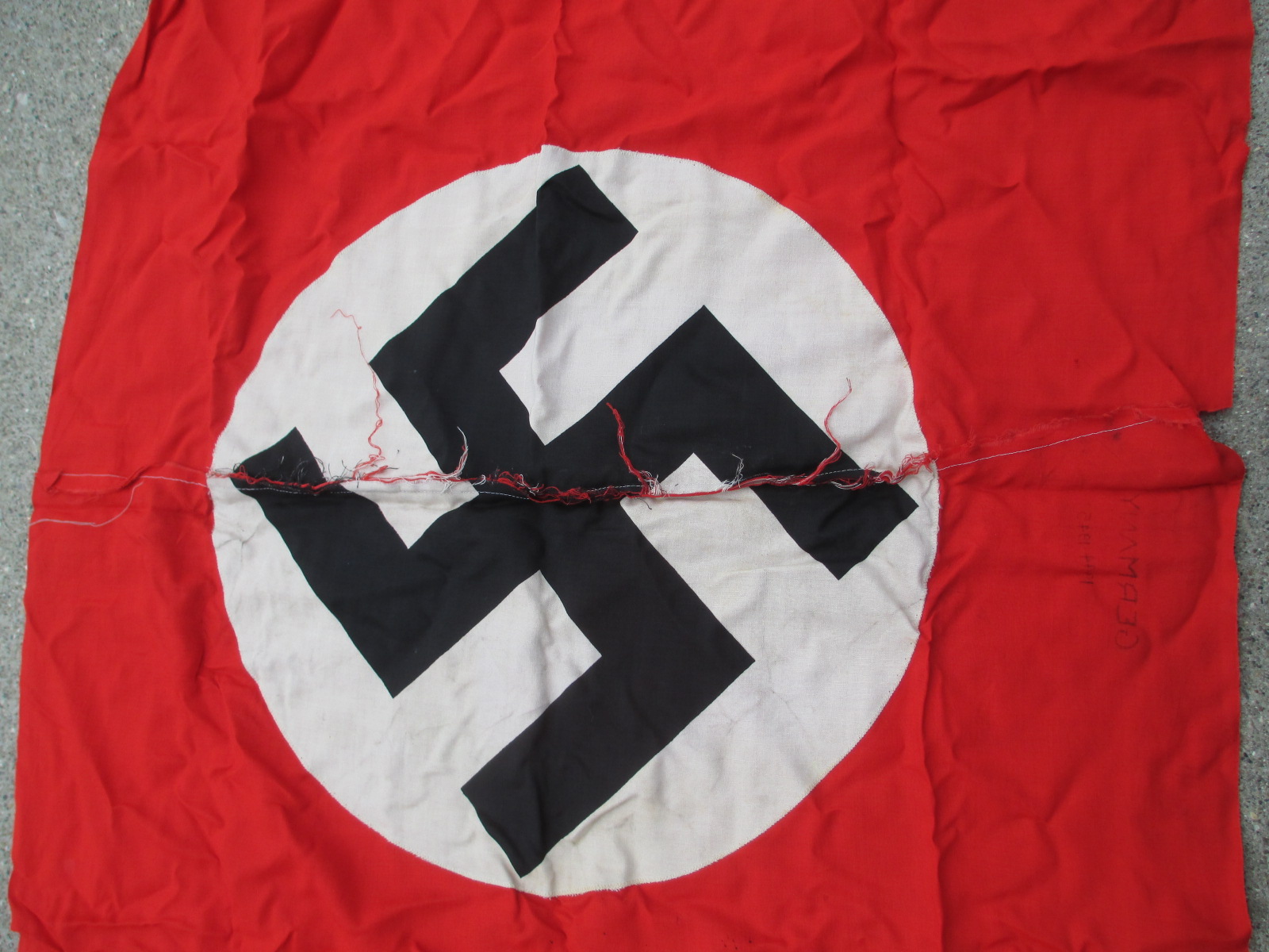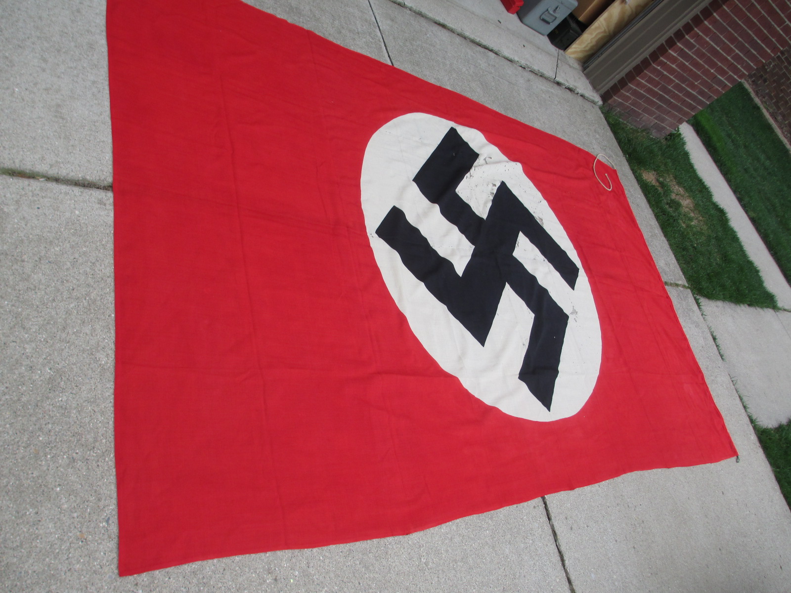 This is a very attractive flag with bright color as and perfect ropes but with some moth damage. It has a very cool NSDAP property stamp in one corner. Sorry, but the moths had a few lunches here with this one mostly in the white sections, but it still looks good. It's still very cool and cheap too.