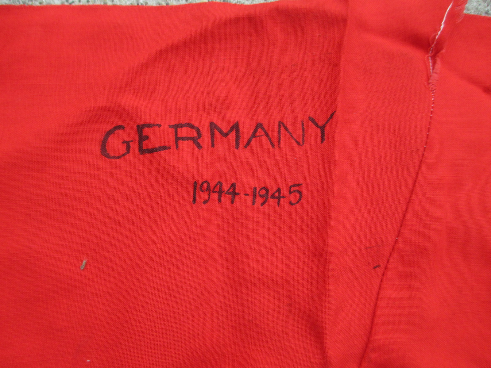 This is a good solid example with nice bright colors. It has G.I. souvenir markings in several places, and a 25 cent price in the corner. Some smart person cut it in half years ago. It has been sewn back together leaving a seam. It's the real thing and priced right.