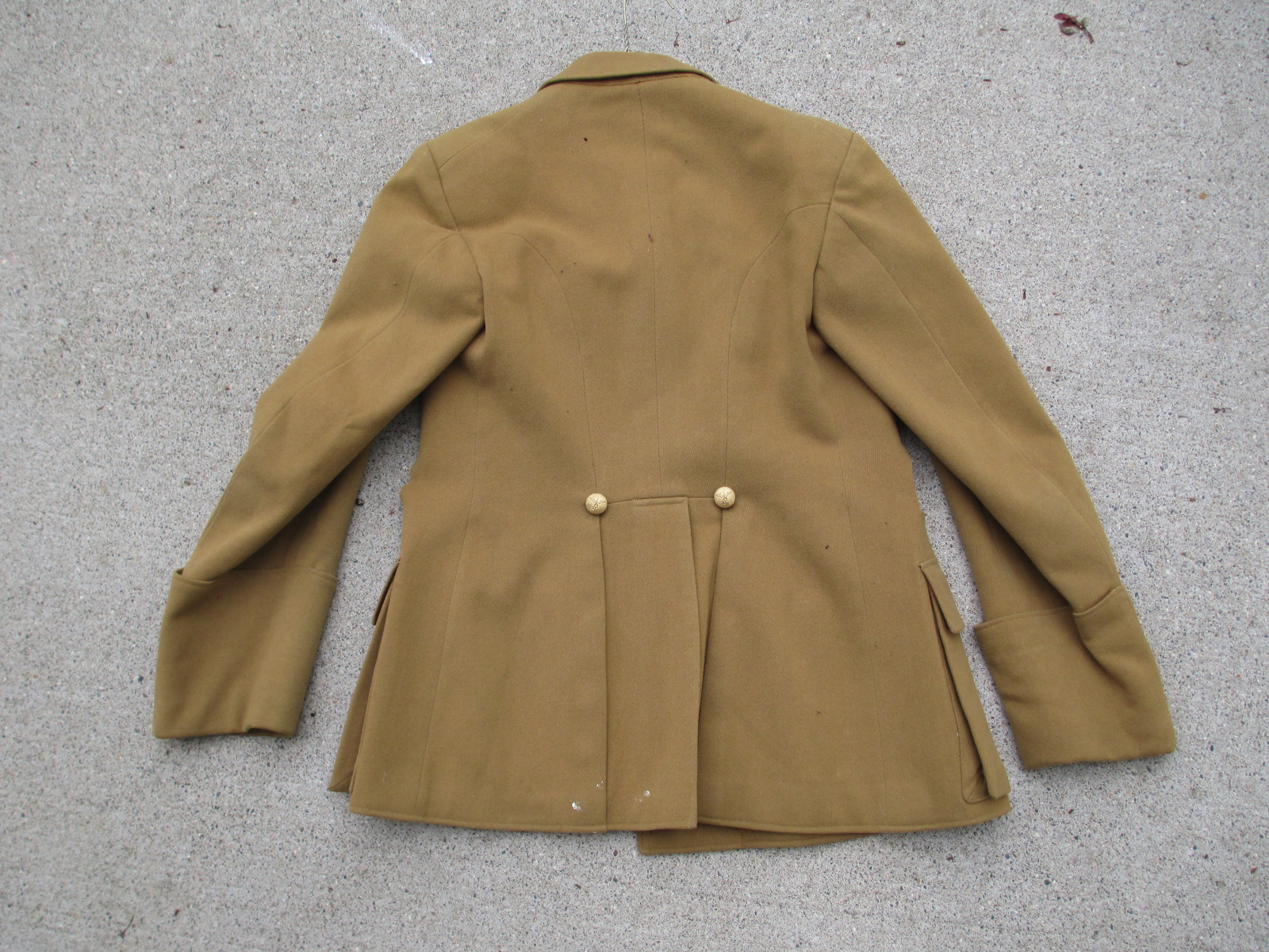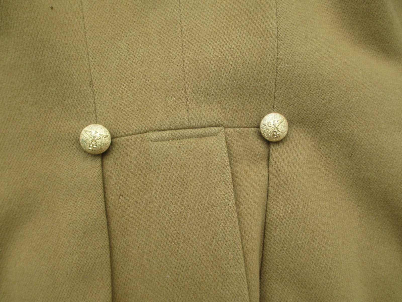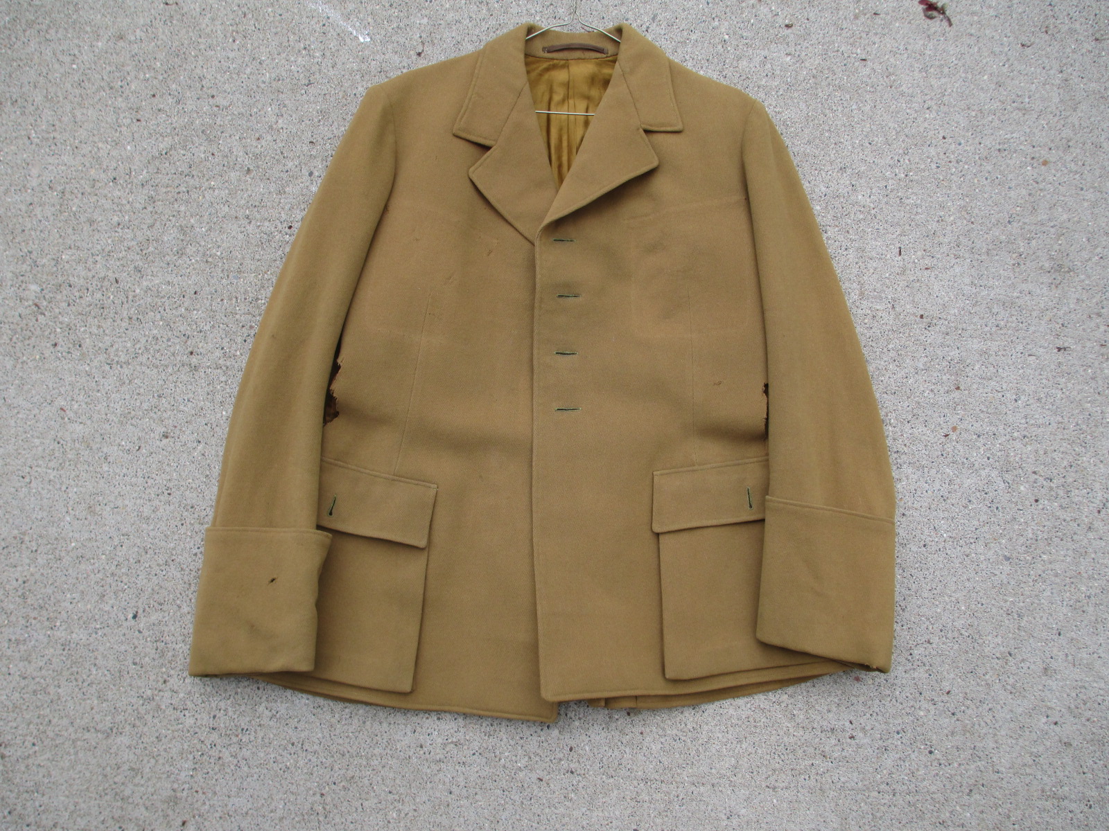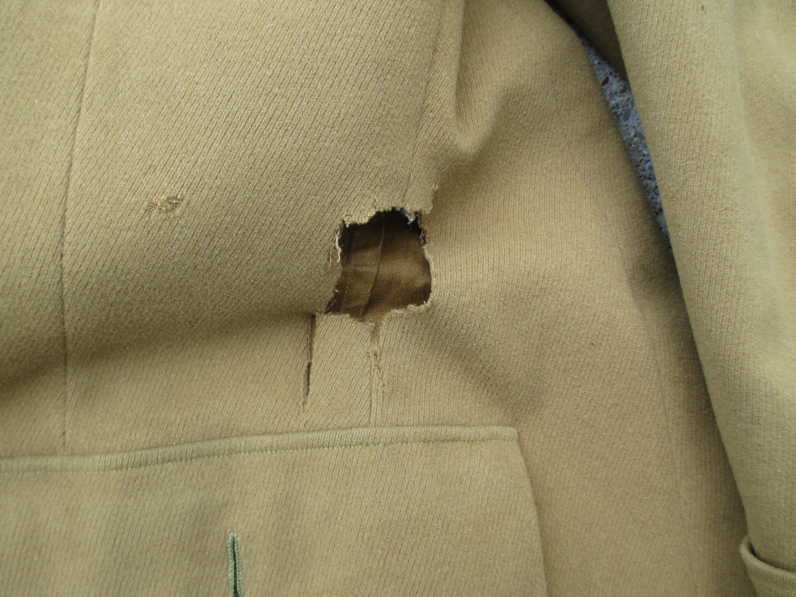 This is a solid tunic. The body is overall good. Yes, 2 holes are at the waist under the arms, and the top pockets are missing. The buttons are also missing, but the back belt hook buttons are there. This is a great restoration project or to use for the original material to display or fix something else.